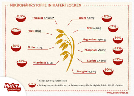 Die Zahlen zur genauen Menge dieser Nährstoffe in Haferflocken und Haferkleie und die Angabe, zu wie viel Prozent eine übliche 40-Gramm-Portion Haferflocken und eine 20 Gramm-Portion Haferkleie die Referenzmenge für die tägliche Zufuhr deckt, finden Sie in unseren Nährwerttabellen.