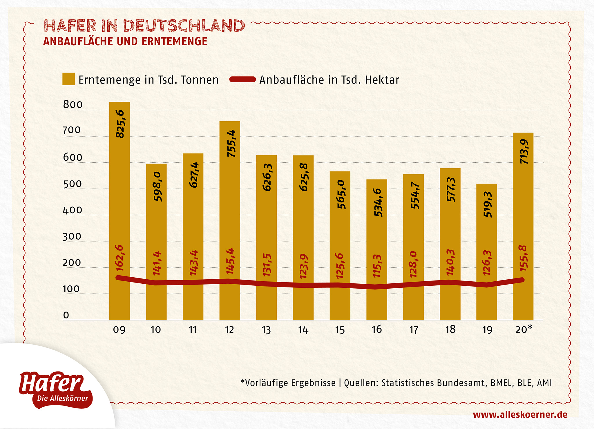 Im Ernährungsbereich findet Hafer bereits seit einigen Jahren immer mehr Anhänger: Die Produktvielfalt ist mit Innovationen wie Porridge-Mischungen, Haferdrink und andere Alternativen für Milchprodukte erheblich gewachsen. Overnight-Oats, Porridge und viele herzhafte Rezepte machen Lebensmittel aus Hafer zum festen Bestandteil in der täglichen Ernährung. Dafür spricht auch das hochwertige Nährstoffprofil des Hafers mit dem Ballaststoff Beta-Glucan, den essenziellen Aminosäuren und komplexen Kohlenhydraten. Hafer hat dadurch zahlreiche gesundheitsfördernde Wirkungen für den Menschen. Auch in der Landwirtschaft gilt Hafer traditionell als „Gesundungsfrucht“. Und auch hier wächst die Bedeutung dieser Getreideart: In diesem Frühjahr ist Hafer in Deutschland auf 155.800 Hektar angebaut worden, was einer Flächenausdehnung von 23 Prozent gegenüber dem Vorjahr entspricht. Geerntet wurden im August 713.900 Tonnen Hafer, 38 Prozent mehr als 2019.